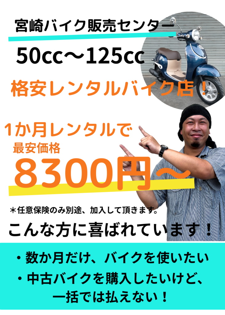 - 原付バイクを購入するより、安い価格でバイクを借りられる!
